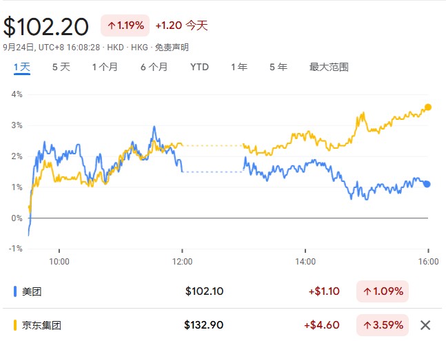 Driven by this news, Meituan's stock price in Hong Kong rose by 3% at one point on Wednesday, while JD.com closed up 3.6%.