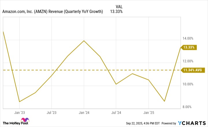Over the past three years, Amazon has averaged a growth rate of around 11%. There have been fluctuations from one period to another, but it has generally been a safe bet to grow by double digits. And in its most recent quarter, which ended on June 30, its top line rose by 13% to $167.7 billion.