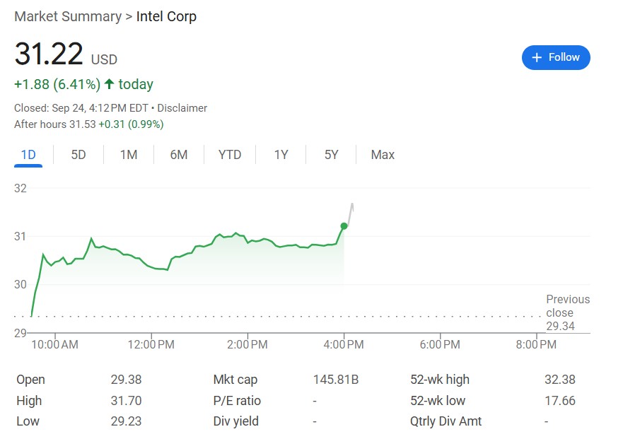 消息傳出後,英特爾股價盤中一度飆升 8% 至 31.70 美元,隨後漲幅小幅回落收漲 6.41%,但在盤後時段股價繼續延續漲勢。