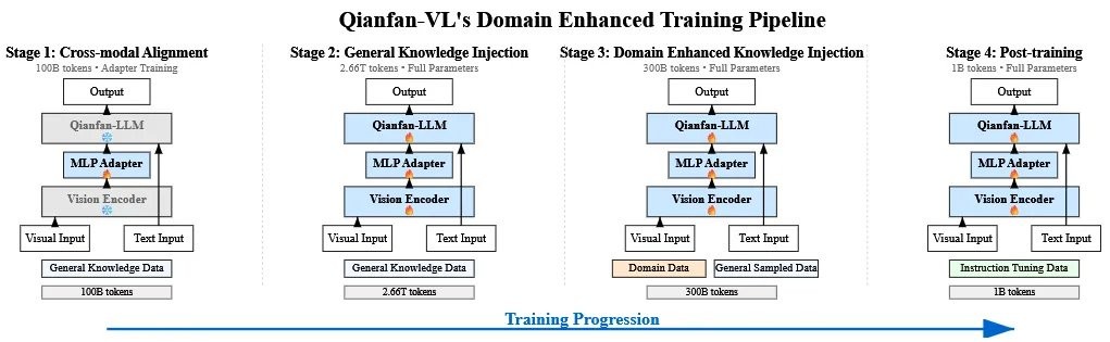 "Cross-modal alignment." The goal of this stage is simple: to let the model's language part and visual part get to know each other and establish the most basic connection. During training, only the connections between them (something called MLP Adapter) are updated, while the language and visual modules themselves are frozen first to avoid mutual influence "General Knowledge Injection." In this phase, the model is fed a massive amount of data, totaling 2.66 trillion tokens of general knowledge data. At the same time, all parameters of the model are opened up for training. The goal of this phase is to lay a solid foundation of general knowledge for the model, making it a well-rounded "generalist."