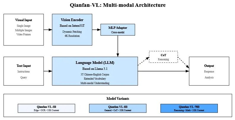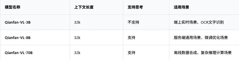 The Qianfan-VL series has three versions: 3B, 8B, and 70B, with parameter counts increasing from small to large, corresponding to different application scenarios.