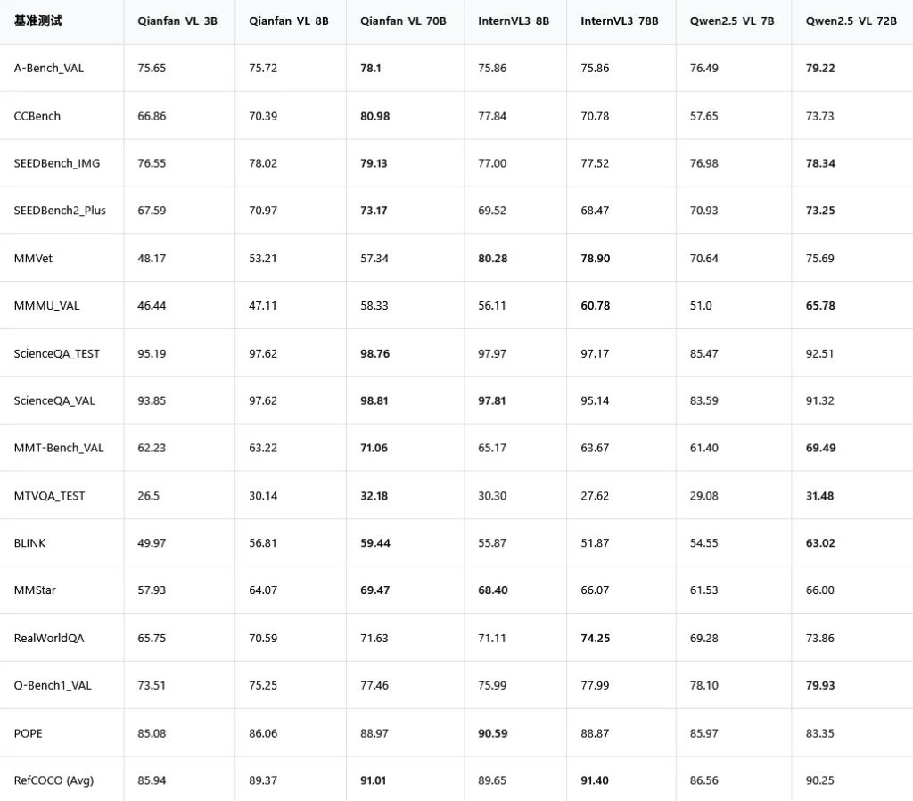 Especially in the Chinese multimodal benchmark test CCBench, Qianfan-VL-70B scored 80.98, while competitors at the same level only scored slightly over 70. This indicates its significant advantage in understanding image and text content in the Chinese context.