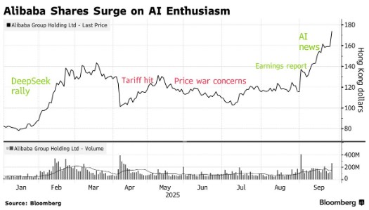 The surge in artificial intelligence is giving rise to a peculiar new phenomenon in the U.S. stock market: large-scale investment plans in AI often lead to a more significant increase in the market value of the investing companies. Taking Alibaba (BABA.US) as an example, on Wednesday, Alibaba's U.S. stock surged by as much as 10%. This came after the company announced that its investment in the AI sector would exceed the previously set target of $50 billion at the beginning of the year. Although the specific total amount of additional expected investment has not been disclosed, this news increased Alibaba's market value by over $35 billion. The company's Hong Kong stock rose by 50% in September, making it the best-performing stock in the Hang Seng Tech Index.