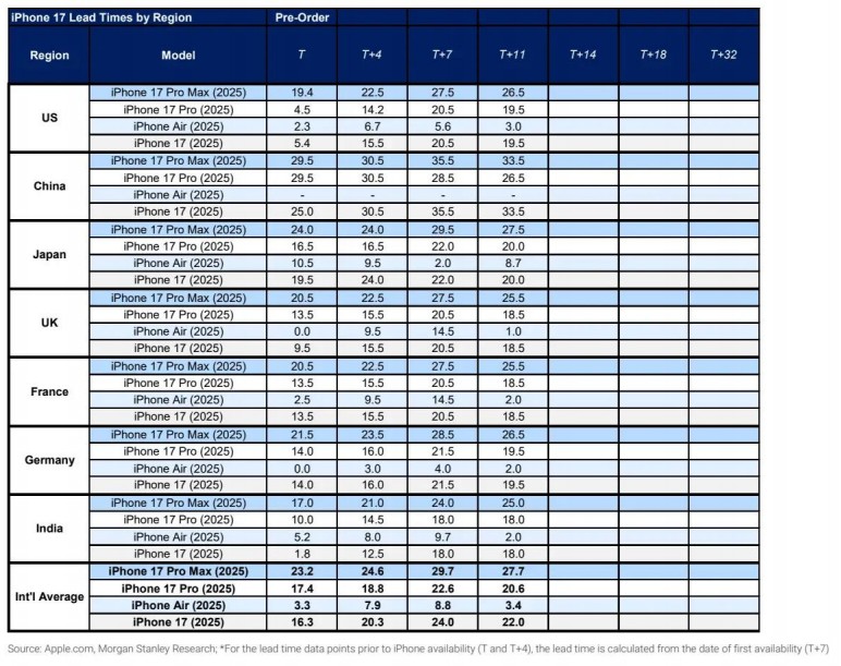 具體到機型,除 iPhone Air 的交付週期短於去年的 iPhone 16 Plus 外,其餘三款新機的交付週期均比前代產品更長。這一趨勢在基礎版 iPhone 17 上尤為明顯,在所追蹤的國家中,其交付週期平均延長了 11 天,其中中國市場更是顯著延長了 19.5 天。考慮到中國市場在第二季度曾進行促銷並提供補貼,這一表現實際上優於市場之前的擔憂。