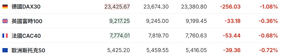 2. 截至發稿,德國 DAX 指數跌1.08%,英國富時 100 指數跌0.36%,法國 CAC40 指數跌0.68%,歐洲斯托克 50 指數跌0.72%。