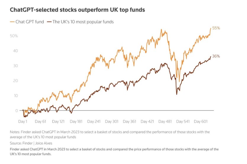 The appeal of AI investment lies not only in the concept. According to media outlet Finder, in an experiment conducted in 2023, the stock portfolio selected by ChatGPT, which included companies like Nvidia, Amazon, Procter & Gamble, and Walmart, achieved an astonishing 55% increase, far outperforming mainstream funds in the UK market.