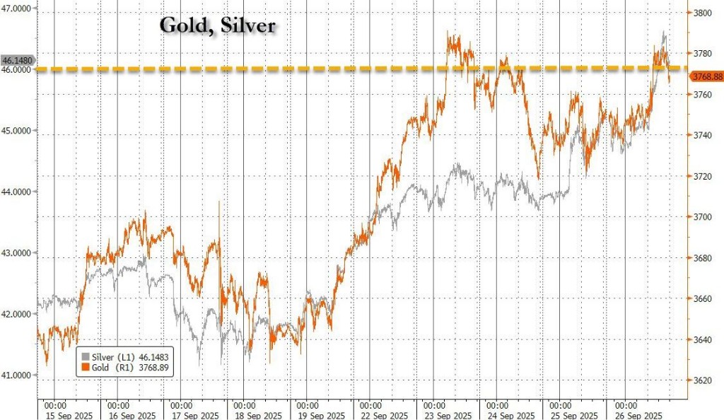 COMEX 黃金期貨漲 0.63%,報 3794.90 美元/盎司,本週累漲 2.37%,9 月 23 日曾經漲至 3824.60 美元。