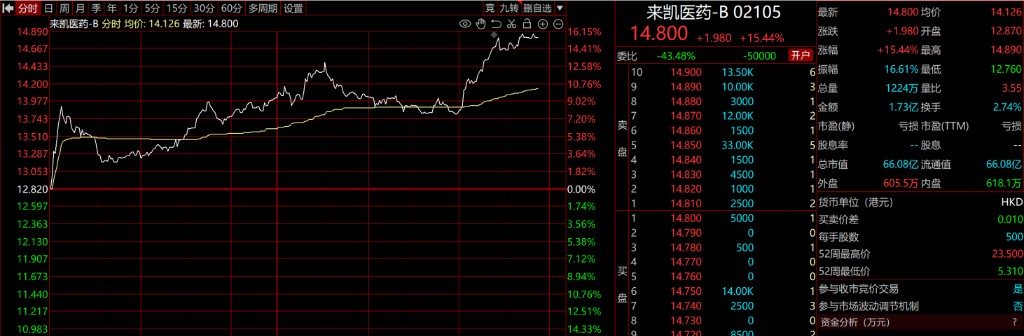 After the news of Eli Lilly halting the trial broke, LianKai Pharmaceuticals (02105.HK) saw its stock price surge against the trend. The stock price of LianKai Pharmaceuticals rose by over 15% at one point. This is partly because bimagrumab's withdrawal from the diabetes trial weakened potential competition, and also highlighted the value of the LAE102 pipeline in collaboration with Eli Lilly.