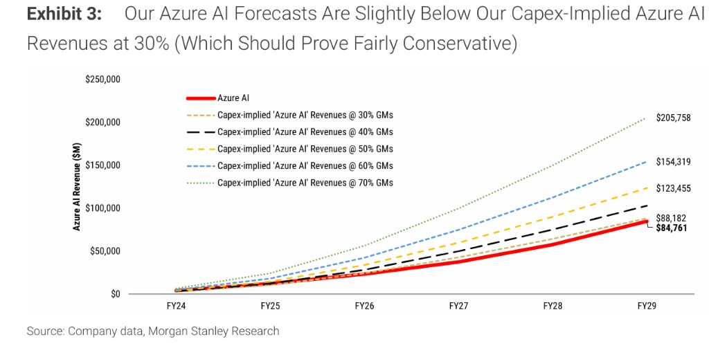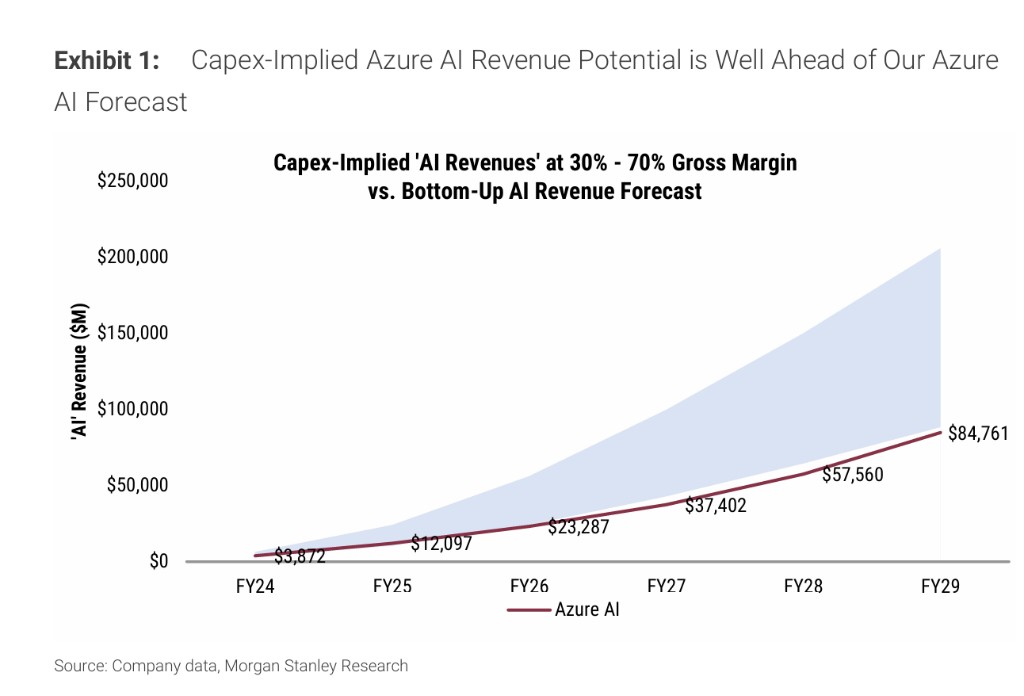 According to Morgan Stanley's estimates, Microsoft's AI-related capital expenditures have continued to increase over the past few years and are expected to reach $10.4 billion in revenue for Azure AI in fiscal year 2025, and exceed $20 billion in fiscal year 2029. Calculations show that even considering a 30% gross margin scenario, the corresponding revenue potential for Azure AI is far higher than current conservative estimates.