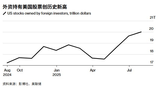 美國銀行全球投資策略主管埃利亞斯·加盧援引財政部國際資本管理部門 (TIC) 及美聯儲截至 7 月的數據進一步佐證:按當前趨勢,外國投資者持有美國股票規模今年有望增加 2.8 萬億美元,總持有量約 18 萬億美元,佔美國近 60 萬億美元股票市場的 30%,創下 1945 年以來的最高水平。