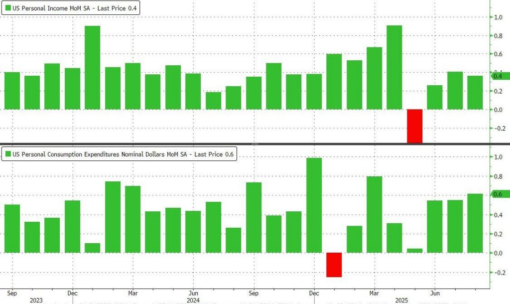 In August, personal income increased by 0.4% month-on-month, higher than the expected value of 0.3%; personal spending increased by 0.6% month-on-month, also exceeding the expected 0.5%.
