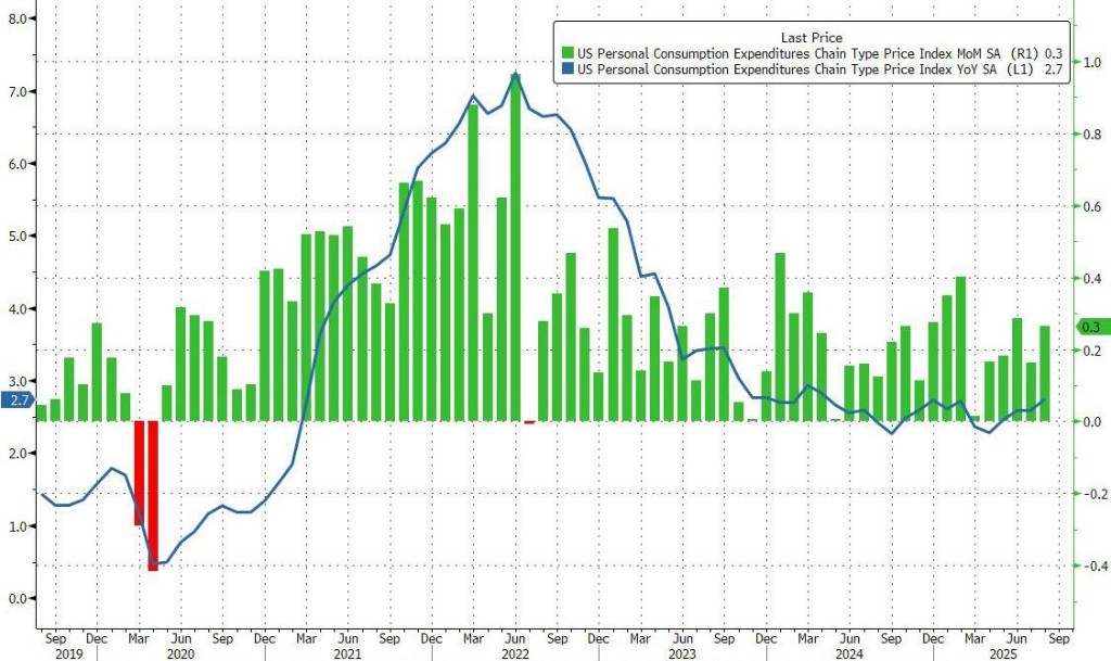 - The U.S. August PCE price index increased by 2.7% year-on-year, in line with expectations of 2.7%, and up from a previous value of 2.6%; month-on-month, it rose by 0.3%, meeting market expectations.