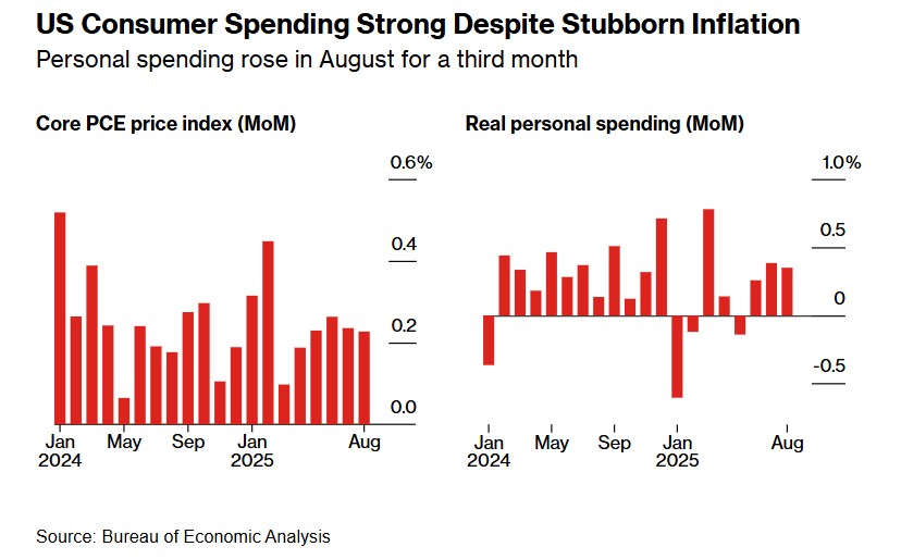 In August, personal spending in the United States increased for the third consecutive month, indicating that consumers are still driving economic expansion despite rising inflation. The core personal consumption expenditures price index rose 0.2% month-on-month and remained at 2.9% year-on-year. Overall PCE inflation increased by 0.3% month-on-month and 2.7% year-on-year. This series of data has boosted market optimism regarding a "Goldilocks" soft landing for the U.S. economy, suggesting that growth is robust and inflation is not overheating, with market expectations for a Federal Reserve interest rate cut remaining largely unchanged