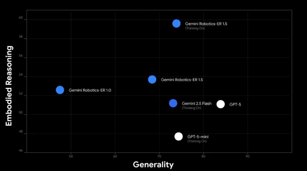 Gemini Robotics-ER 1.5 is the first thinking model optimized for this embodied reasoning. It has achieved top industry levels in both academic benchmarks and internal benchmark tests.
