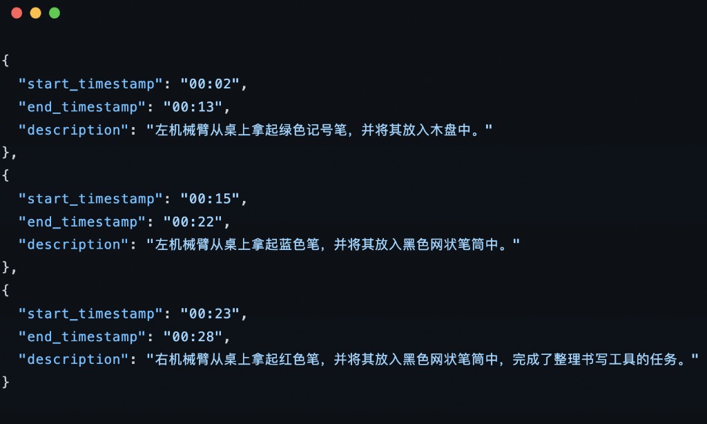 For example, in a video, the robotic arm first places a green marker into a wooden tray, then places blue and red markers into a pen holder. When we ask the model to describe the task steps in order, it provides a completely correct answer