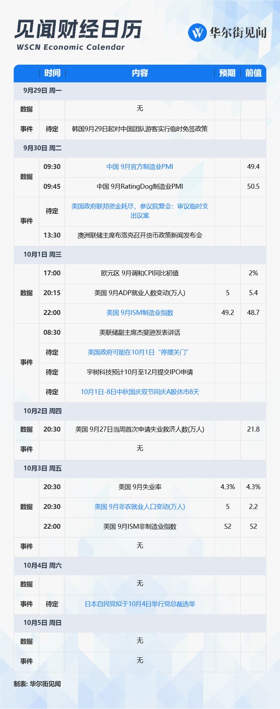 The U.S. federal government funding will run out on September 30, and if Congress does not take action by September 29, a government shutdown will begin on October 1. U.S. non-farm payroll and ADP employment data will be released, along with the September PMI for China and the U.S. If the government shuts down, the release of U.S. data may be delayed. The A-shares market will be closed for 8 days due to the Mid-Autumn Festival and National Day celebrations. The Liberal Democratic Party of Japan plans to hold a presidential election on October 4