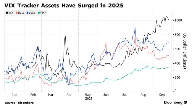 追蹤 Cboe 波動率指數 (VIX) 期貨表現的規模最大產品——巴克萊 iPath 標普 500 VIX 短期期貨交易所交易票據 (ETN),今年資產管理規模增長逾 300%,突破 10 億美元。這類產品的吸引力在於:若當前創紀錄的股市漲勢消退,市場波動性便會驟升,進而帶來可觀回報。