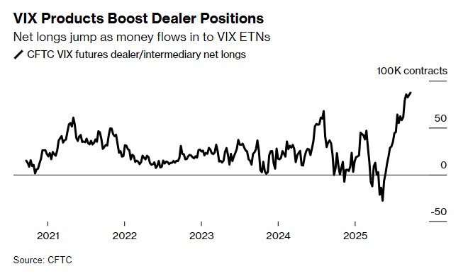 研究公司 Asym 500 創始人 Rocky Fishman 指出,散户交易員 “希望採取謹慎、具備保護性的策略”。他估算,目前 VIX 期貨約 40% 的未平倉合約由 VIX 類 ETP 持有。