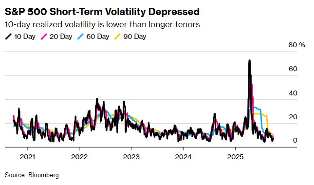 隨着股市穩步走高,隱含波動率 (市場對未來價格波動幅度的最佳預估) 在很大程度上受到抑制。核心原因在於近期市場實際波動幅度較小——若近期走勢顯示價格大幅波動的可能性很低,交易員便不願為押注波動的期權支付高價。