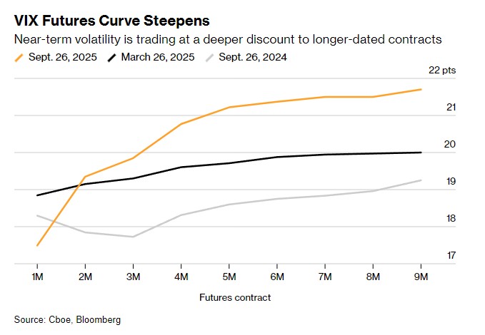 這種現象在短期波動率上尤為顯著,標普 500 指數的交易區間始終收窄。這使得短期期權的隱含波動率維持在低位,進而壓低 VIX 現貨指數及近月期貨價格。