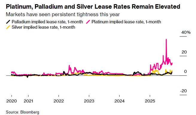 Meanwhile, other precious metals have also experienced unprecedented supply tightness this year. Due to the increasingly prominent issue of supply shortages over several consecutive years, the inventory of freely traded precious metals in the London market has been continuously decreasing, further exacerbating market concerns. The leasing rates for silver, platinum, and palladium (which reflect the cost of borrowing metals in the short term) have all surged significantly, far exceeding the near-zero normal levels