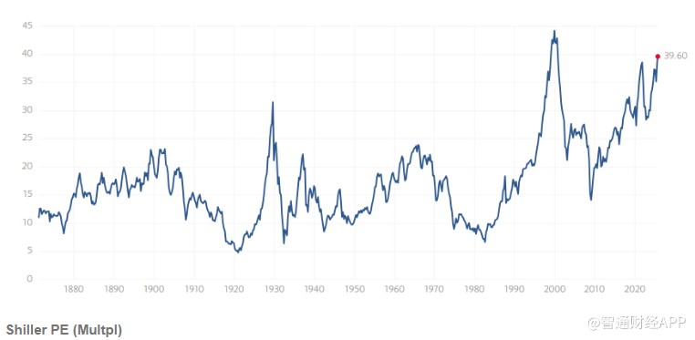 The Shiller price-to-earnings ratio is close to 40, a level that has only been seen twice in history and is currently slightly below the level reached in 1999. The "Shiller price-to-earnings ratio," or cyclically adjusted price-to-earnings ratio (CAPE), calculates the price-to-earnings ratio using a 10-year average of earnings after removing the effects of inflation, smoothing out the impact of economic cycles on valuations. Historical data shows that when the CAPE of U.S. stocks exceeds 25 times, it enters a period of "irrational exuberance."