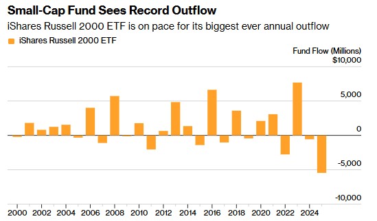 According to the Zhitong Finance APP, the most risky sector in the U.S. stock market has performed strongly in recent weeks, with investors who have suffered multiple losses from small-cap stocks over the past four years cashing in on these paper gains. From the fund flow of the largest exchange-traded fund (ETF) tracking the Russell 2000 Index, investors are rapidly taking profits, and their profit-taking speed is almost synchronized with the withdrawal speed. Approximately $5.4 billion has been withdrawn from the iShares Russell 2000 ETF this year, while the index has also climbed to a historic high.
