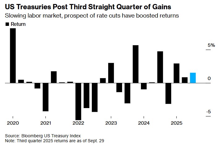 Bloomberg data shows that U.S. Treasury yields generally fell on Tuesday, and so far this quarter, U.S. Treasuries have achieved a return of 1.5%. In the first three quarters of 2025, the return on U.S. Treasuries exceeded 5%, likely marking the best performance since 2020.