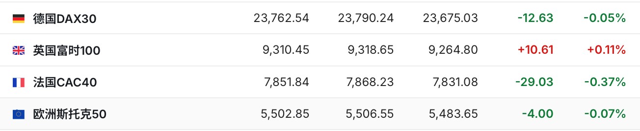 2. 截至發稿,德國 DAX 指數跌 0.05%,英國富時 100 指數漲 0.11%,法國 CAC40 指數跌 0.37%,歐洲斯托克 50 指數跌 0.07%。