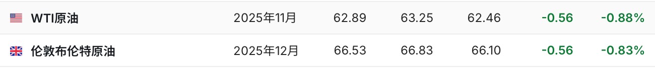 3. 截至發稿,WTI 原油跌 0.88%,報 62.89 美元/桶。布倫特原油跌 0.83%,報 66.53 美元/桶。