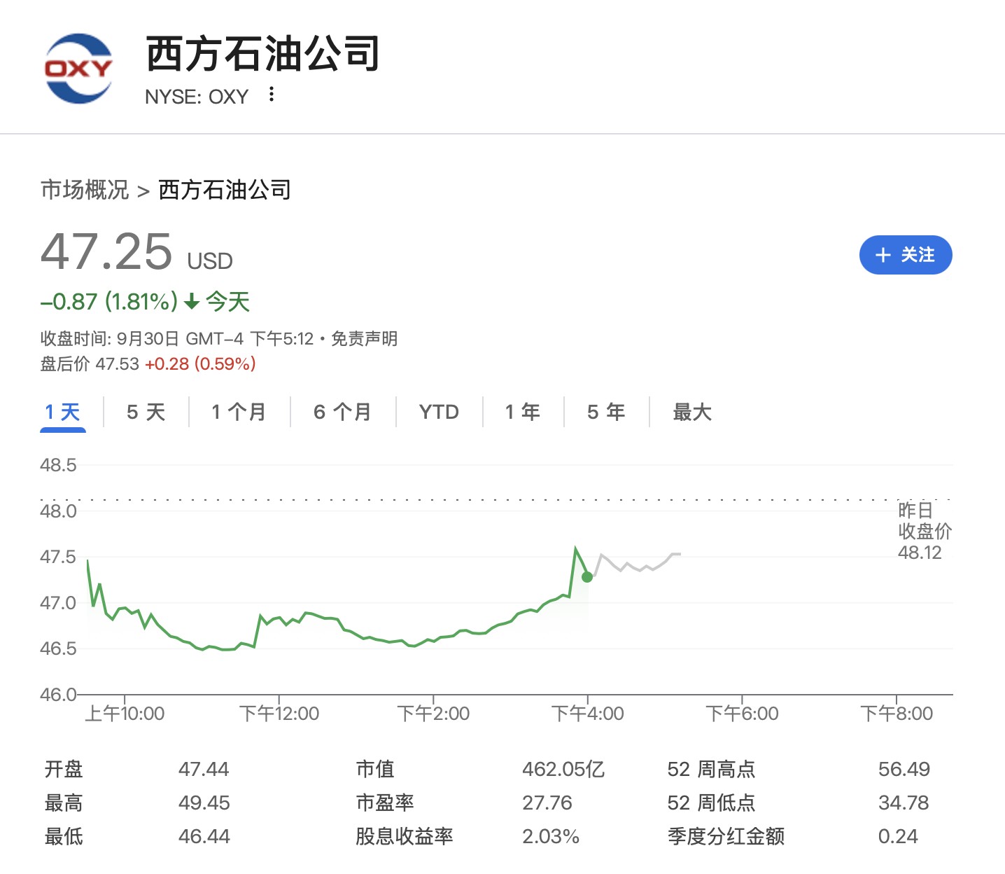 Occidental's stock price fell 1.81% on Tuesday, closing at $47.25, and rose 0.59% in after-hours trading.