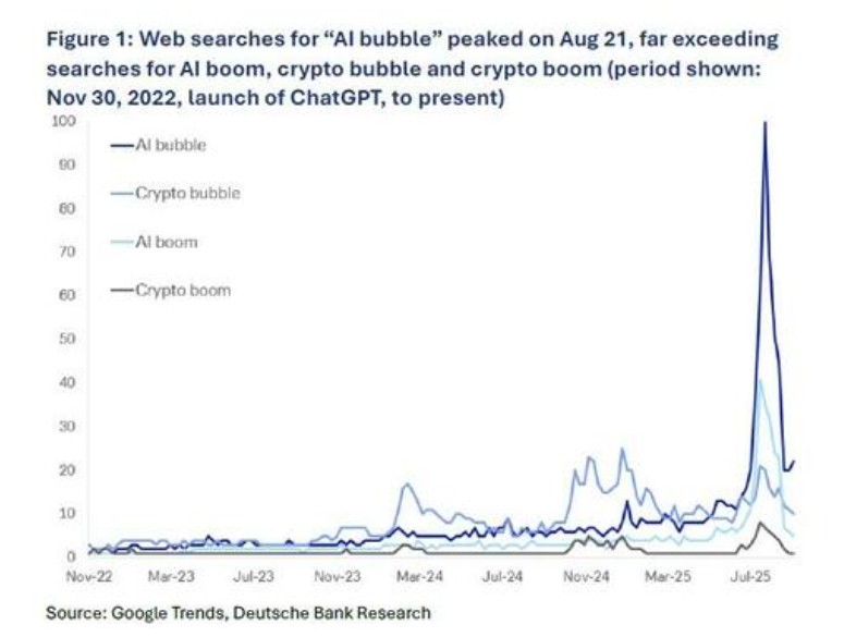 As structural financial risks become increasingly prominent, public discussions about the AI bubble are cooling down. Deutsche Bank analyst Adrian Cox pointed out that global search volumes for "AI bubble" have dropped by 85% from their peak in August 2025. In other words, the "bubble of discussing the AI bubble" has itself burst.