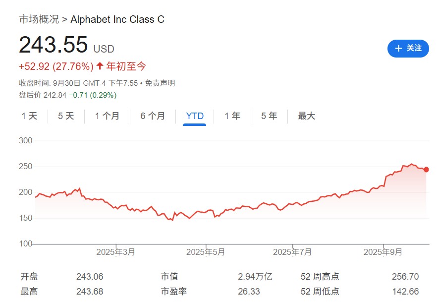 Alphabet 的 A 類股在第三季度飆升 38%,這是自 2005 年以來的最大季度漲幅。這一表現使其年初至今的漲幅超過 28%,在備受關注的 “科技七巨頭” 中位居第二,僅次於芯片製造商英偉達。