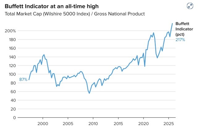 Data shows that the S&P 500 has rebounded nearly 40% since its low in April, led by large tech companies. Meanwhile, the "Buffett Indicator" (the ratio of total market capitalization to GDP) has soared to 217%, far exceeding the highs during the internet bubble and the COVID-19 pandemic in 2021. Buffett has referred to this level as "playing with fire."