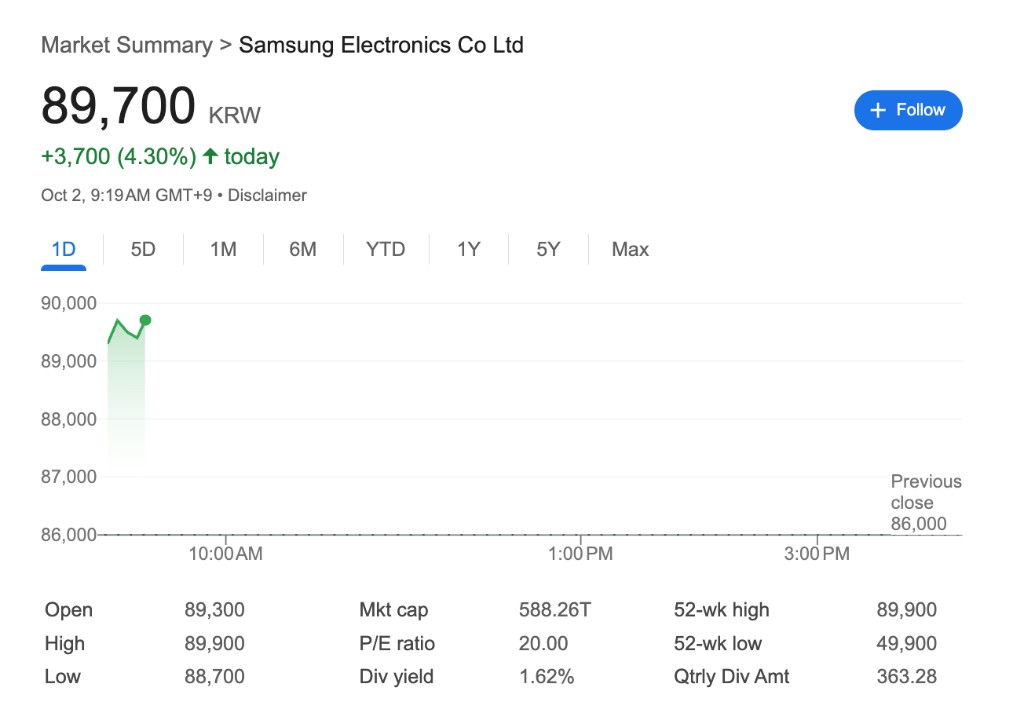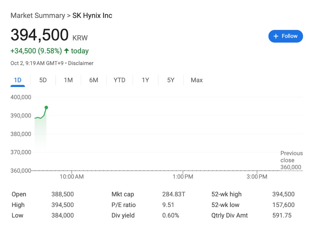 On Thursday, October 2, Samsung's stock price rose by 4.5%, while SK Hynix's stock price increased by 9.7%, marking the largest intraday gain since April.