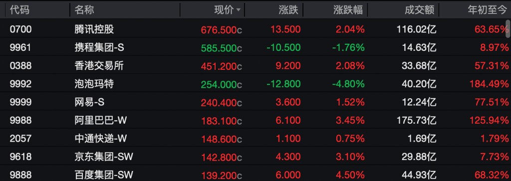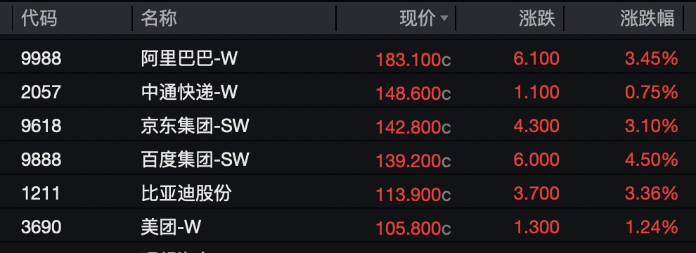 截至收盤,阿里、京東漲超 3%,網易、美團漲超 1%,快手漲超 8%。