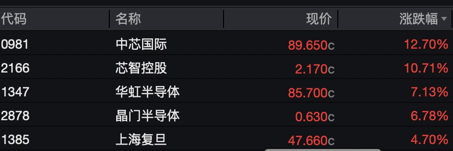 中芯國際漲超 12% 創歷史新高,芯智控股漲超 10%,華虹半導體漲超 7%,晶門半導體漲近 7%。