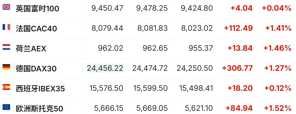 - As of the time of writing, the German DAX index was up 1.27%, the UK FTSE 100 index was up 0.04%, the French CAC40 index was up 1.41%, and the European Stoxx 50 index was up 0.52%.