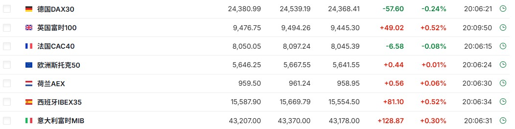 2.截至發稿,德國 DAX 指數跌 0.24%,英國富時 100 指數漲 0.52%,法國 CAC40 指數跌 0.08%,歐洲斯托克 50 指數漲 0.01%。