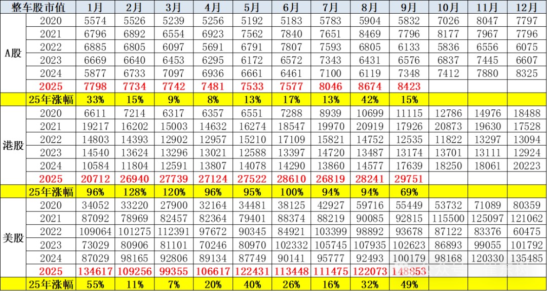 Cui Dongshu pointed out that Tesla's market value has surpassed 1 trillion, with a price-to-earnings ratio as high as 200 times, while the valuations of international traditional car manufacturers are relatively low. The changes in market value of complete vehicles in September show that new energy remains the main growth driver, and there is a clear trend of improvement in the market value of fuel vehicle companies. The performance of international car companies in the US stock market is average, while domestic companies in the Hong Kong stock market perform excellently. Overall, the market value of Hong Kong automotive stocks increased from 1 trillion yuan in January 2024 to 2.97 trillion yuan in September 2025, while the A-share market rose from 580 billion yuan to 840 billion yuan, with a more moderate growth rate