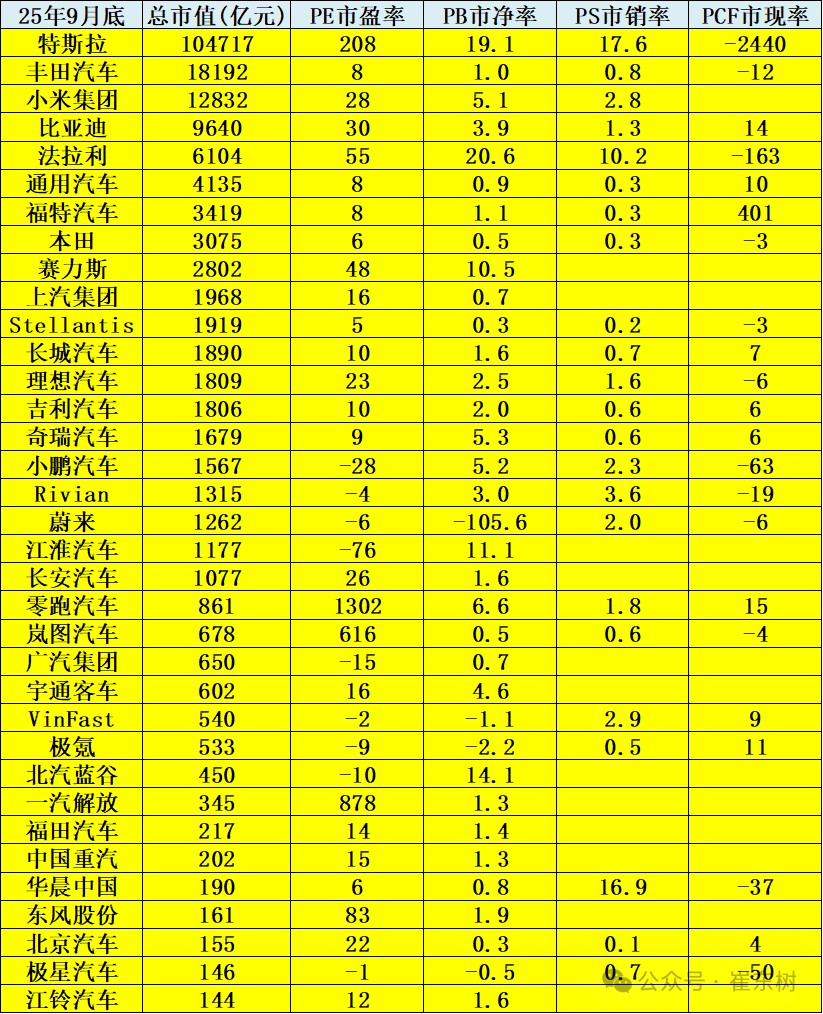 From the perspective of comprehensive price-to-earnings ratio and price-to-book ratio, it can be said that the price-to-earnings ratios of new force companies like Tesla are relatively high. Especially with Tesla's scale of 1 trillion yuan, the price-to-earnings ratio reaches 200 times, while companies like Leapmotor (09863) and Voyah also have relatively high price-to-earnings ratios.