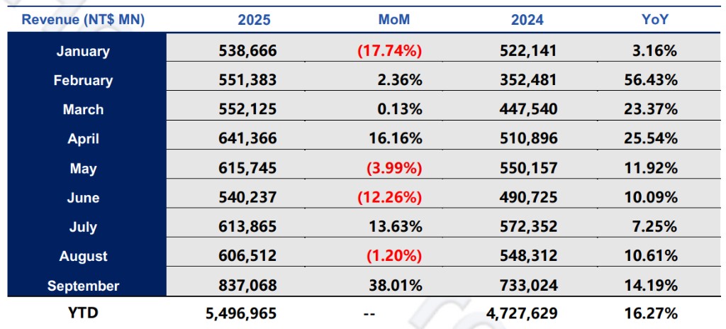 9 月營收達到 8,371 億新台幣,這一數字不僅較 8 月大幅增長 38.01%,同時也創下歷史同期新高,超越了此前 2022 年 9 月創下的 8,223 億新台幣紀錄。