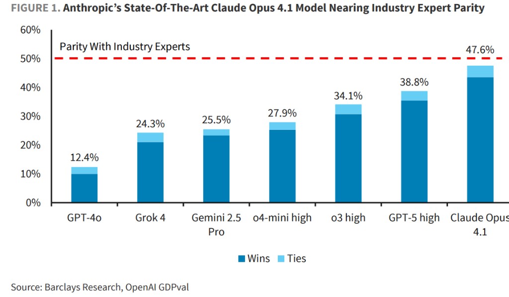 結果顯示,當前最頂尖的 AI 模型在執行許多職業任務時,其能力已與人類專業人士相當,並且這種能力的提升速度正在加快。10 月 5 日,據硬 AI 消息,巴克萊在最新研究報告中稱,Anthropic 的 Claude Opus 4.1 在與人類專家對比中取得 47.6% 的"勝利或平局"率,位居榜首。