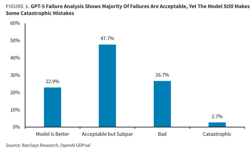 巴克萊分析師認為,AI 模型的原始智能,特別是 GPT-5,已達到超越人類專家的水平。通過更多後期訓練 (微調、強化學習),AI 全面超越行業專家的時代已為時不遠。