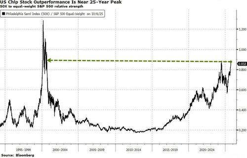 The relative performance of the semiconductor index (SOX) compared to the equal-weighted S&P 500 index is nearing its highest level since the internet bubble.