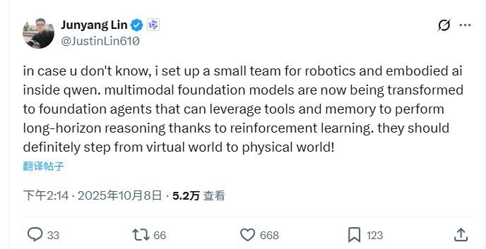 In addition to announcing the establishment of the "Robotics and Embodied AI Group," Lin Junyang also stated in a post on X that "multimodal foundation models are now being transformed into basic intelligent agents, which can utilize tools and memory to perform long-sequence reasoning through reinforcement learning." He emphasized that these applications "should move from the virtual world to the real world."