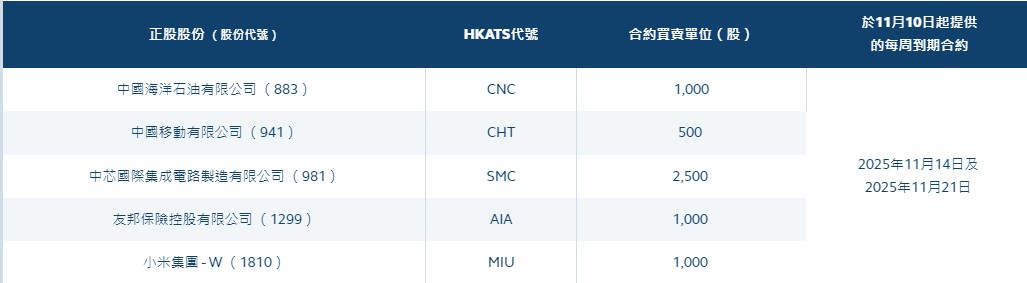 智通財經 APP 獲悉,港交所今天 (10 月 9 日) 宣佈,將於 2025 年 11 月 10 日 (星期一) 起為中國海洋石油 (00883)、中國移動 (00941)、中芯國際 (00981)、友邦保險 (01299)、小米集團 (01810) 等五隻股票期權類別新增每週合約。新推出的每週期權合約將與月度合約互補,為投資者提供更具彈性及有效的短期風險管理工具。