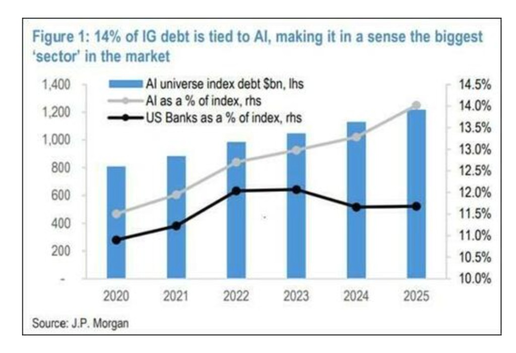 The debt scale of AI-related companies has surpassed that of traditional banking, becoming the largest sector in investment-grade bond indices. Analysts warn that if the AI paradigm shifts, the bursting of the AI credit bubble will have a greater impact than a stock market crash