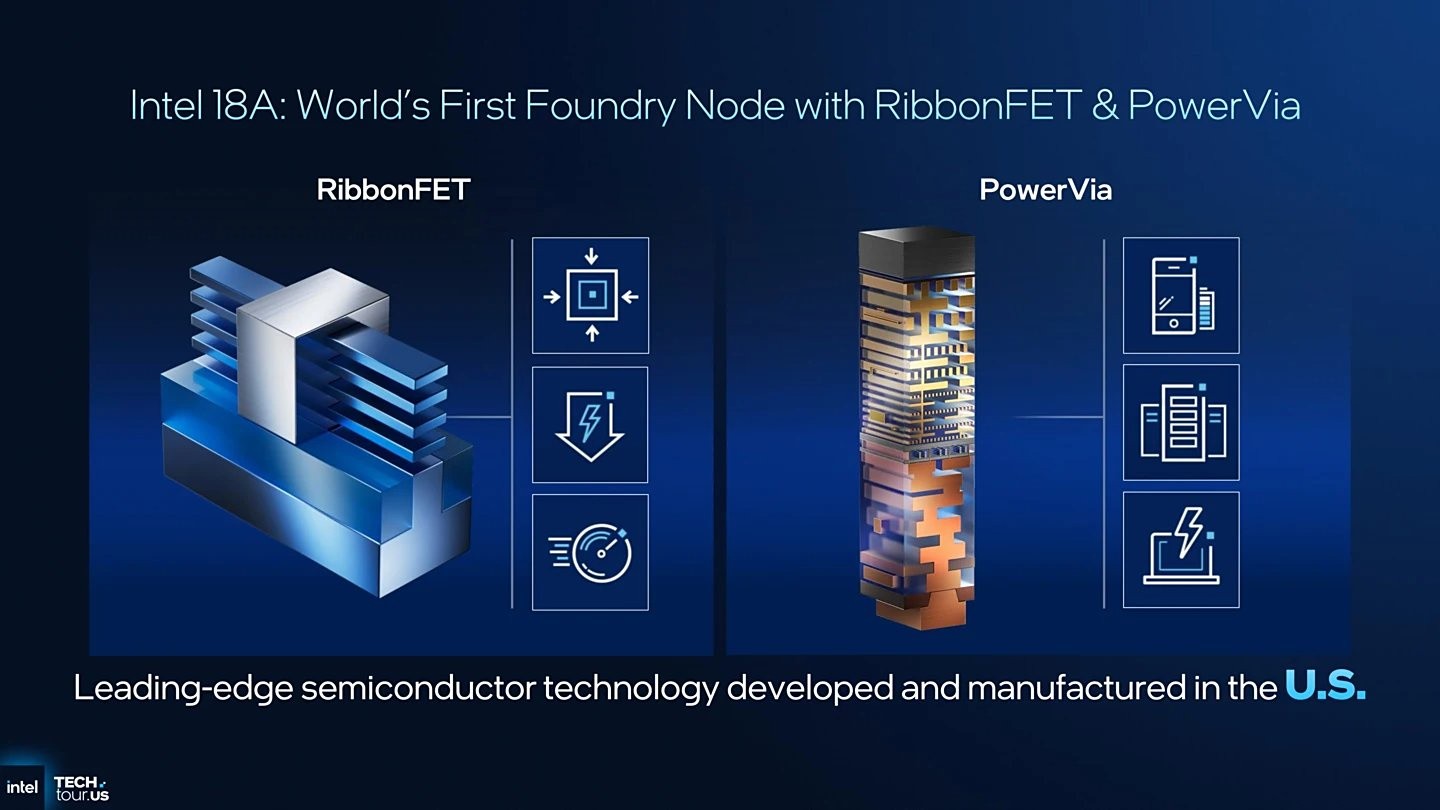 The 18A process integrates two major innovations: RibbonFET fully wrapped gate transistor technology and PowerVia back power delivery system. RibbonFET is Intel's first new transistor architecture in over a decade, achieving better scaling and more efficient switching performance. PowerVia is a groundbreaking back power delivery system that enhances power flow and signal transmission.
