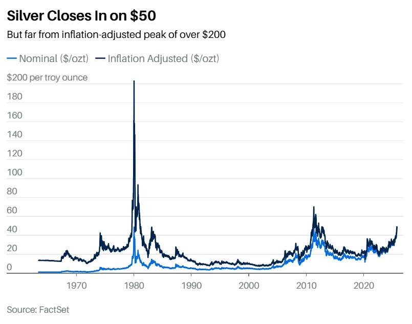 COMEX 12 月白銀期貨盤前一度漲至 49.965 美元,逼近 1980 年創下的 50.35 美元盤中最高紀錄,但隨後轉跌,午盤刷新日低至 46.89 美元,日內跌 4.3%。現貨白銀在美股早盤曾漲至 51 美元上方,創 1980 年亨特兄弟操縱市場逼空事件以來新高,日內漲 4.8%,但到美股午盤時,一度幾乎抹平所有漲幅。